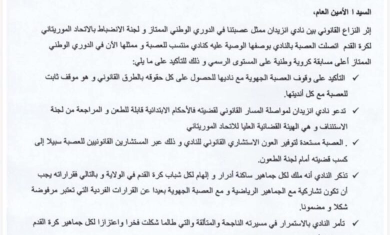 وأكدت الرسالة كذلك أن نادي انزيدان يمثل جماهير ولاية آدرار وشبابها، ما يفرض – بحسب المراسلة – ضرورة التشاور مع الجماهير الرياضية والعصبة الجهوية بعيدًا عن أي قرارات فردية قد تثير الجدل.