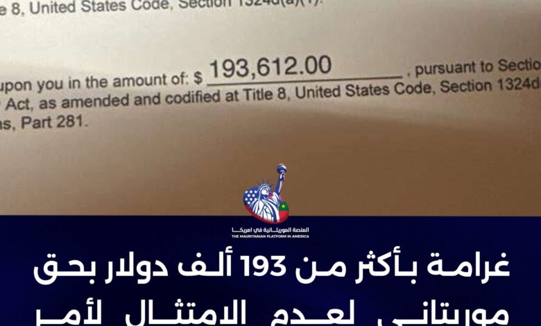 أصدرت سلطات الهجرة الأمريكية قراراً بفرض غرامة مالية مدنية كبيرة على مهاجر موريتاني بعد اعتباره غير ممتثل لأمر ترحيل نهائي صدر بحقه بتاريخ 28 يوليو 2025، وذلك استناداً إلى المادة 274D من قانون الهجرة والجنسية الأمريكي (INA)، والمدونة ضمن الباب الثامن من القانون الفيدرالي الأميركي (8 U.S.C §1324d).