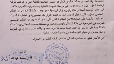 أعلن حزب الاتحاد من أجل التخطيط والبناء (UPC) عن إقالة نائب رئيسه محمد فال ولد أحمد من صفوفه وتجريده من…